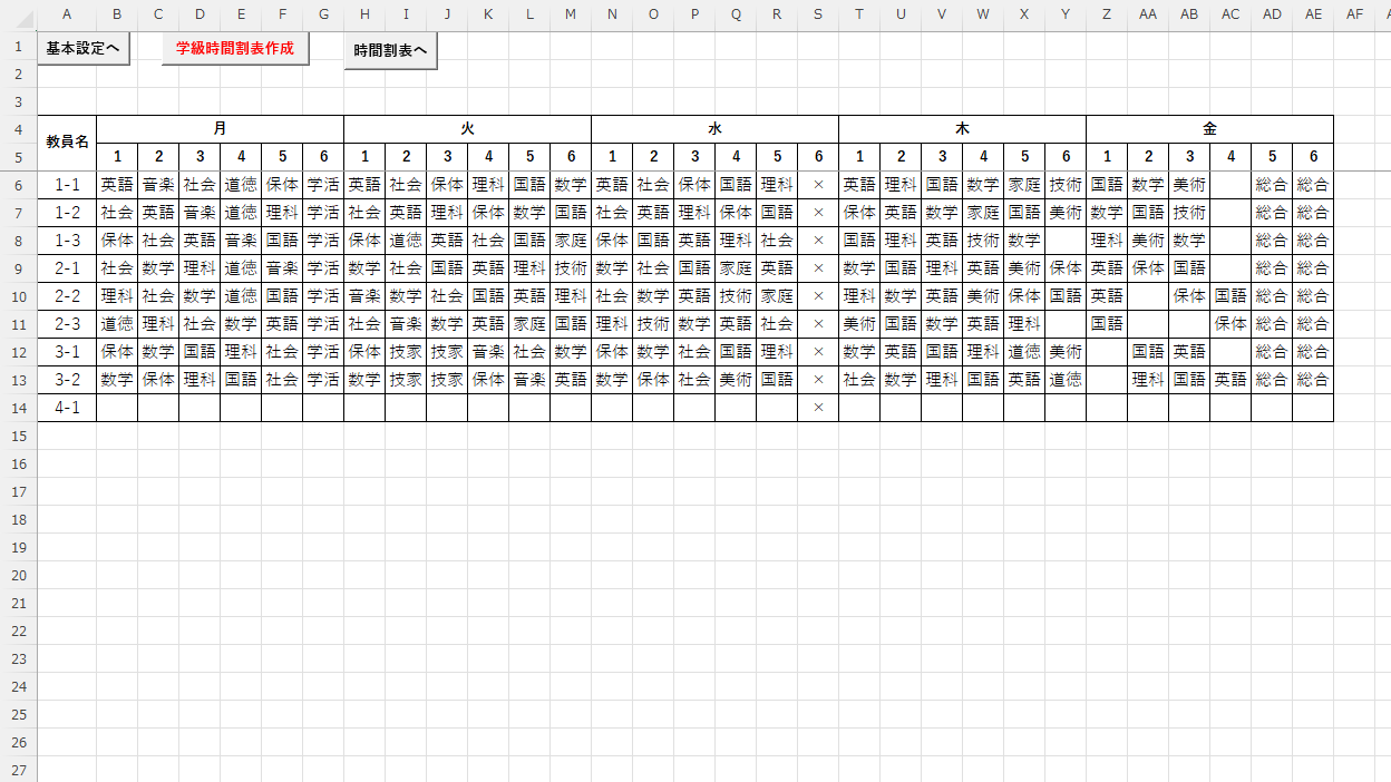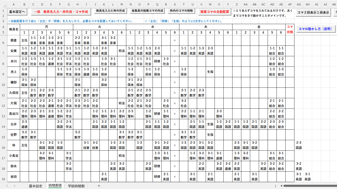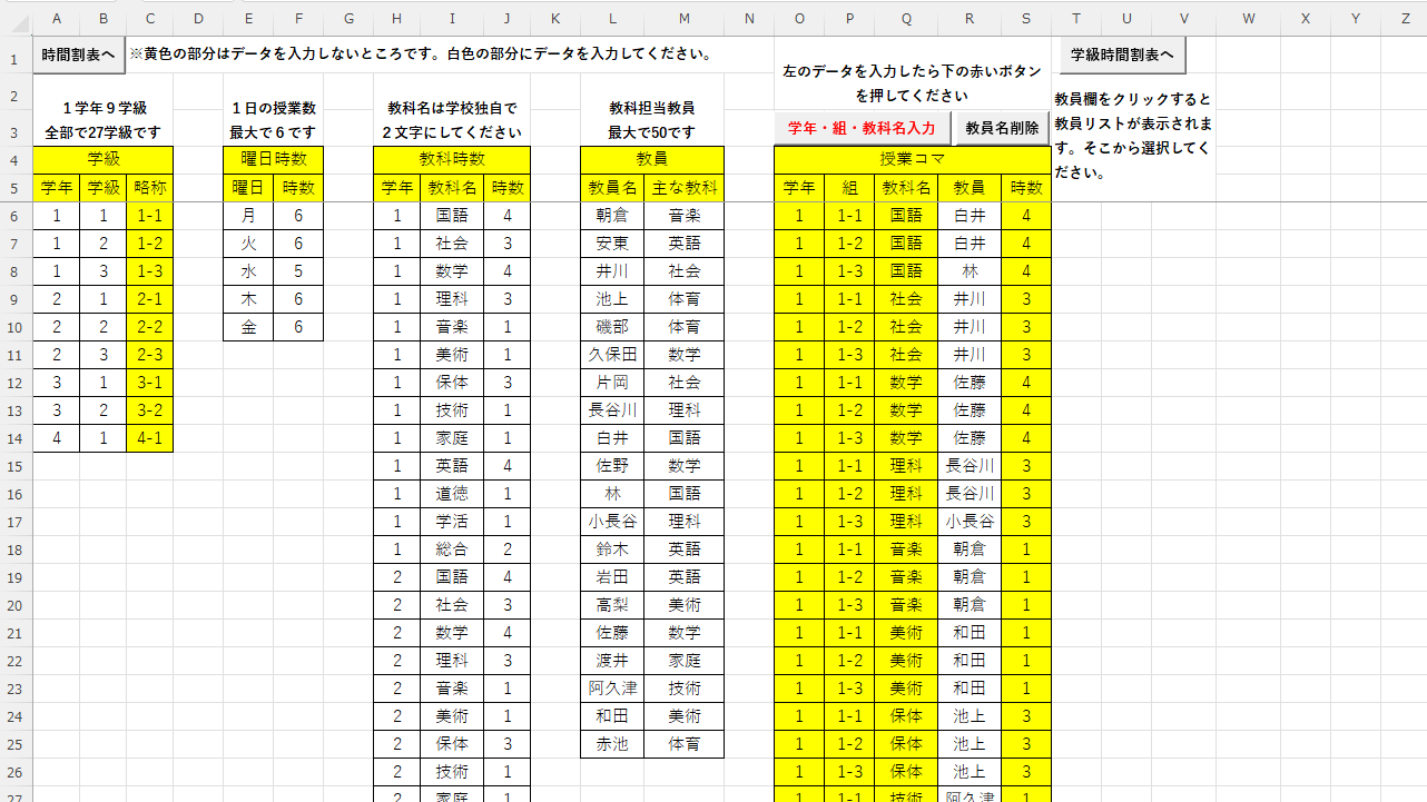 学級と学年、各曜日の時数、教員名、各学年の教科名と時数を入力するだけで時間割表を作成し、自動配置をしたあと、クリックだけでコマの移動・交換ができ、移動可能なセルを黄色で表示してくれる、超簡単な時間割作成ファイルです。学級時間割の作成もできます。週ごとに時間割を変更することも簡単にできます。時間割ソフトが、設定が難しくて大変、結局自動配置でコマが全部埋まるわけでもなく、コマを動かすのも面倒、ということもあり、時間割作成のハードルは高かったですが、このファイルを使えば、誰でも時間割を作成することができます。 ![]() |